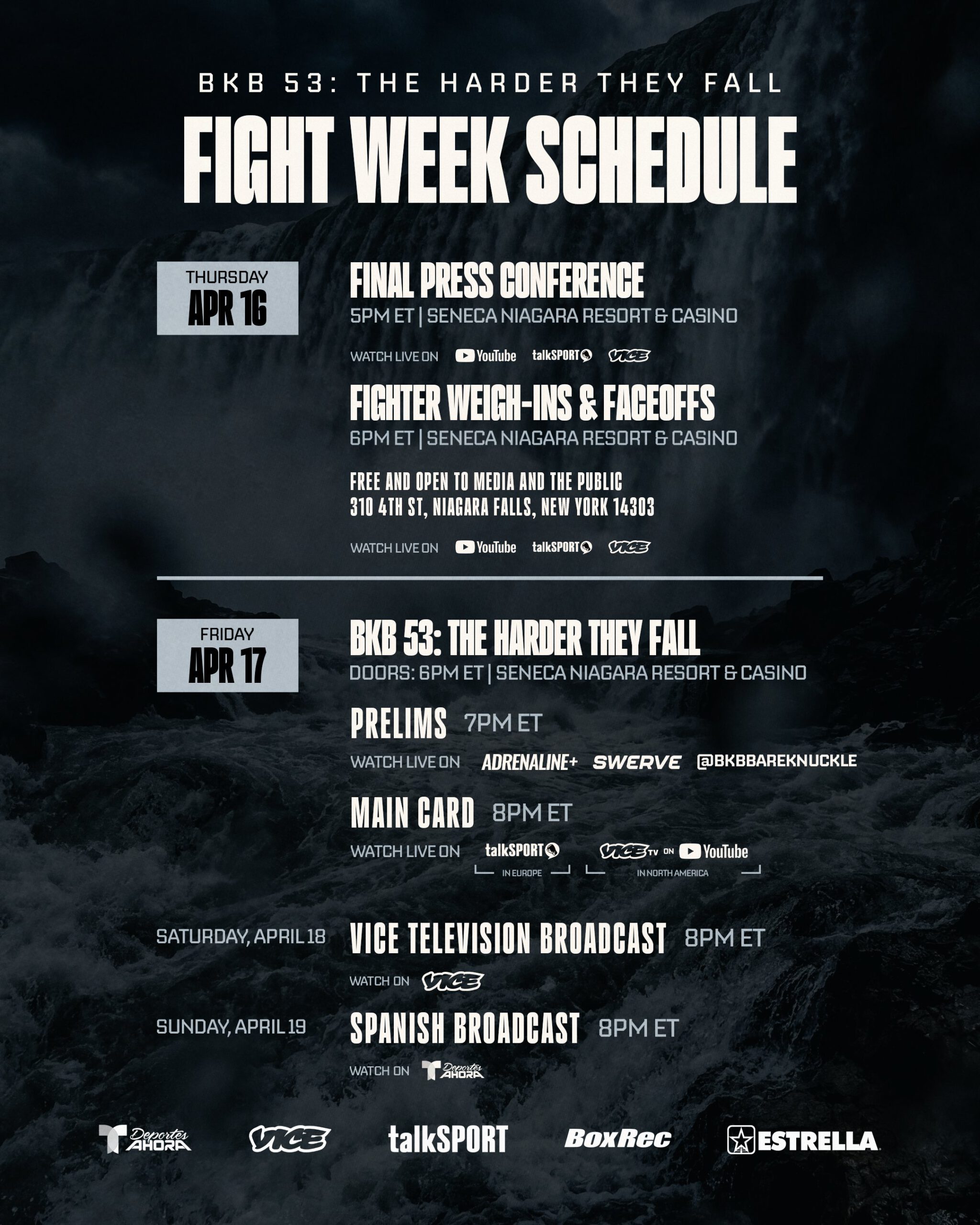 BKB 53: The Harder They Fall is the promotion’s first event in scenic Niagara Falls, New York, USA. The Seneca Niagara Resort & Casino hosts the hostilities.