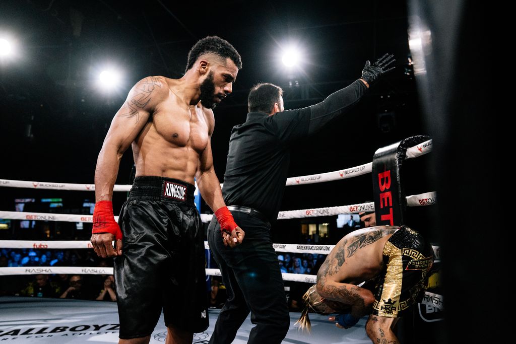 A right uppercut-right body shot-right uppercut-left hook combo sent Guymon to the canvas. He put his hands on the ropes as referee Andrew Glenn counted to ten.